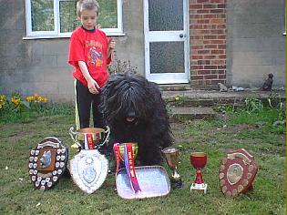 Benji had a really brilliant year in 1999 taking 4 cc and 2 Rcc plus res best in show at the British Briard club open show (judge B Wills) and res best in show at the British Briard championship show ( Judge F Summerfield) and being top black dog for 1999 (BBC Points) and top black male (Briard Association Points) and res best dog at briard association open show (Jane Martin) 99. Photo above is Benji taking a good look at all the silver wear he has won last year and a really big thank you to Darren Clarke for handling Benji to most of his big wins but most of all a big hug and lots of kisses must go to Benji for being the most gorgeous dog ever But we are biased !!! Sorry